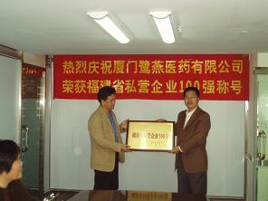 由福建省私營企業協會、福建日報社聯合開展的2005年度“福建省私營企業100強”評定活動,于近日揭曉最終入圍企業,廈門鷺燕醫藥有限公司榜上有名。今天,市工商局的領導來我司進行了授牌儀式。儀式上,吳金祥總裁向領導們介紹了鷺燕的成長歷程,并對將來的經營進行了展望。領導們在聽取了吳總裁的匯報后,肯定了鷺燕的發展模式,同時,也對鷺燕的可持續發展提出了許多有益的建議。
